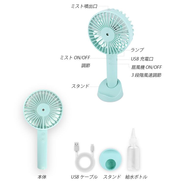 ミスト ハンディファン 熱中症対策 ミニUSB扇風機 USB充電 ポータブル 強風 3段階調節 スタンド