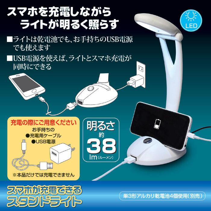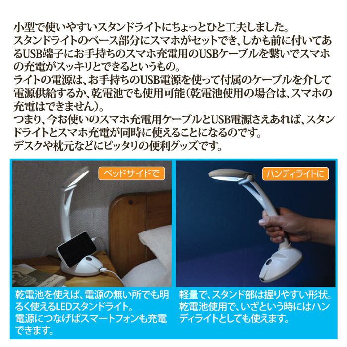 スタンドライトのベース部分にスマホがセットでき、しかも前に付いてあるUSB端子にお手持ちのスマホ充電用のUSBケーブルを繋いでスマホの充電がスッキリとできるというもの。
