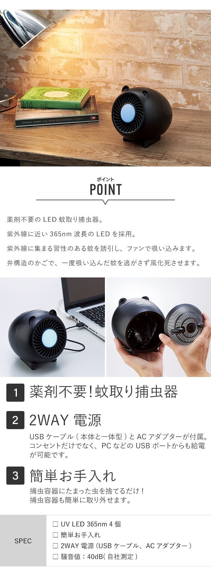 薬剤不要のLED蚊取り捕虫器