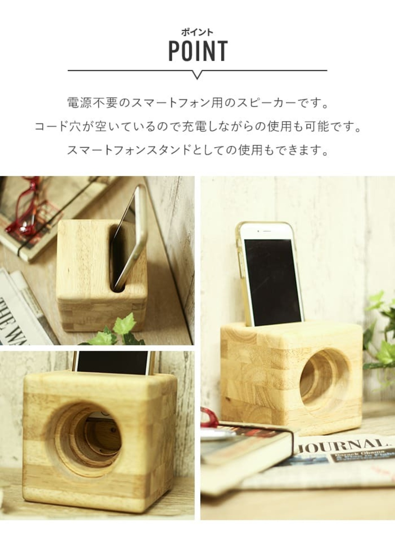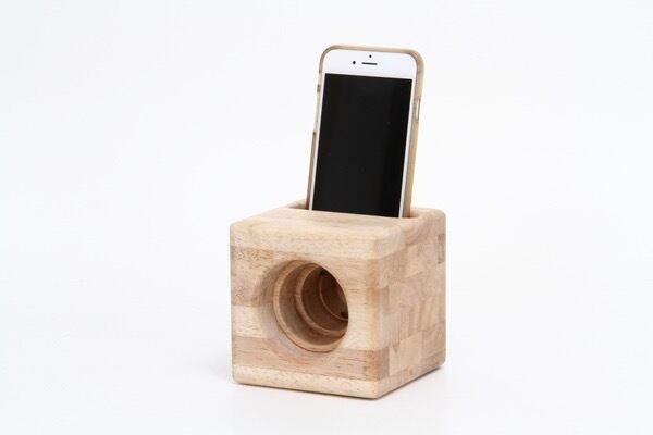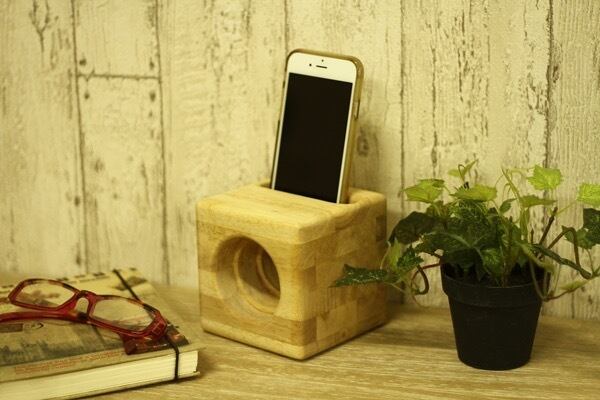 スマホを置いている音楽を流すだけで、自然な音の広がりが感じられる木製スピーカー。