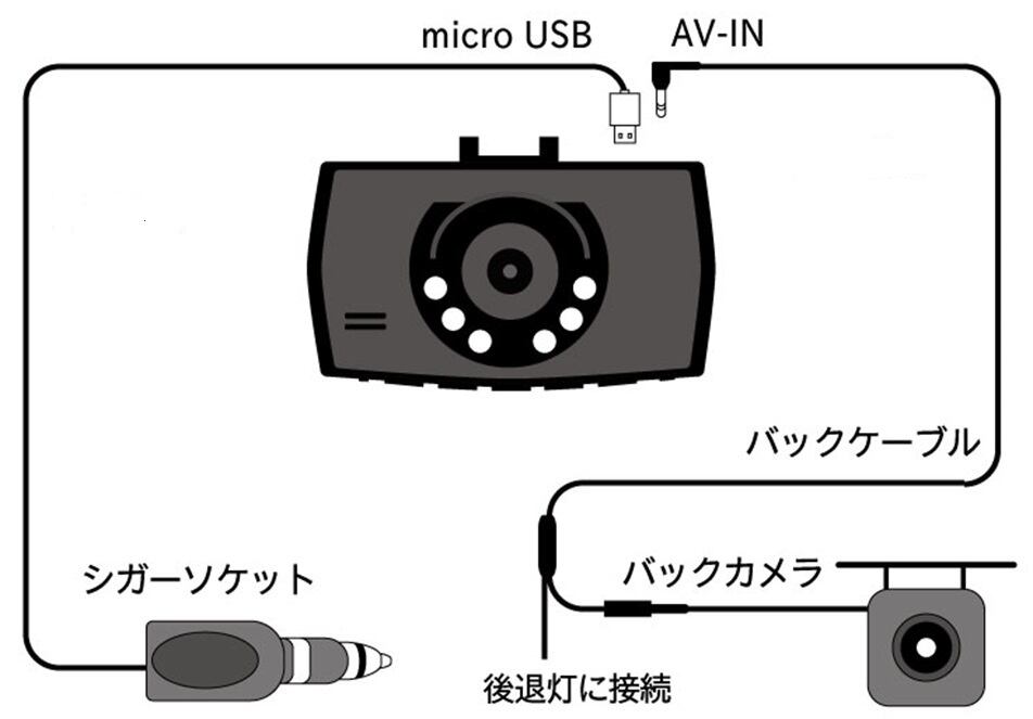 【同梱物】ドライブレコーダ本体、リアカメラ(ケーブル込み)、シガーケーブル、取扱説明書*マイクロSDカードは付属していません。
