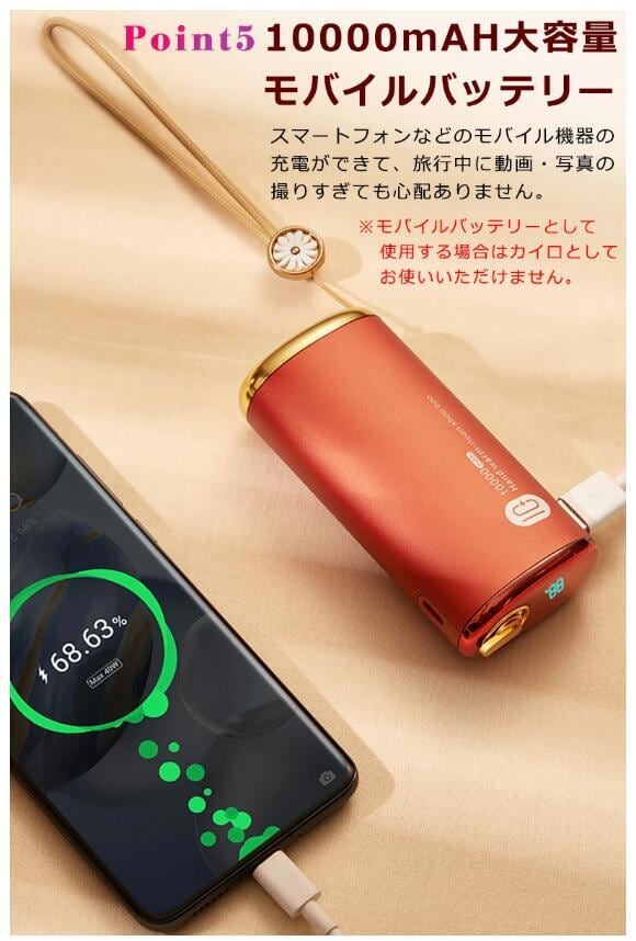 このカイロは、充電式であるため、使い捨てのカイロと違い、何度でも繰り返し使用することができます。また、モバイルバッテリーも内蔵しており、スマートフォンやタブレットの充電も同時に行うことができます。便利な機能が満載ですね。