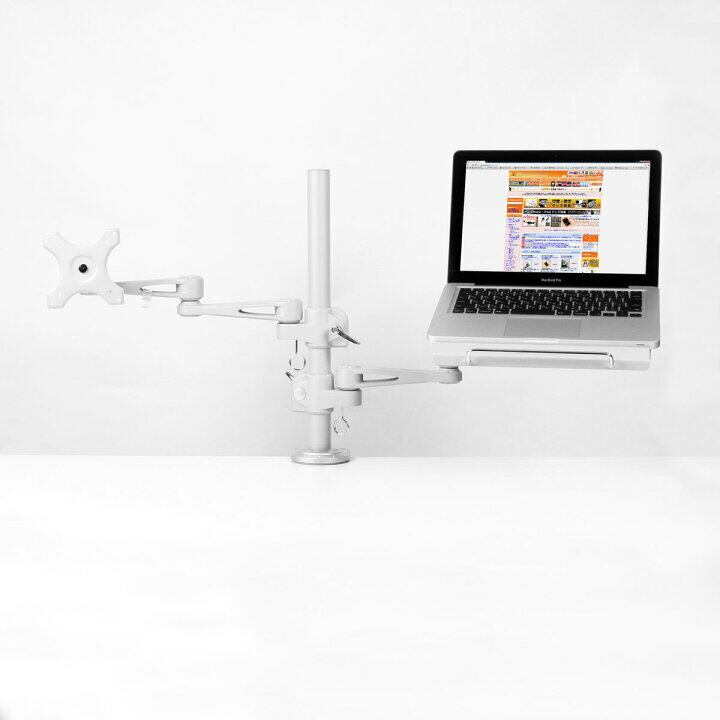 ノートパソコンとサブモニタを一緒に搭載可能なアームです。