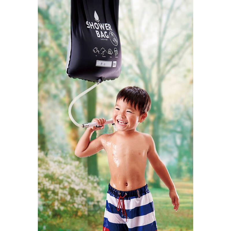 持ち運べるポータブルシャワー災害時の水浴び用として、キャンプでも使用できます。